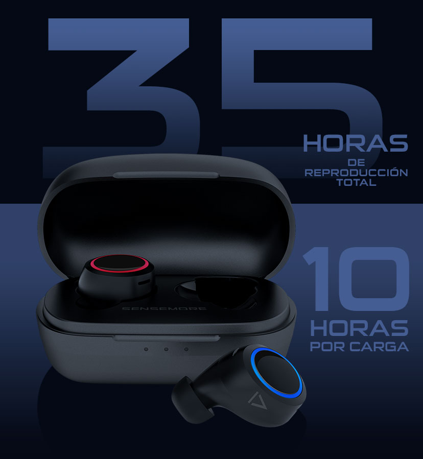 Potencie su día con Creative Sensemore Air. Los auriculares ofrecen hasta 10 horas¹ de tiempo de reproducción con una sola carga junto con 2.5 cargas adicionales, por un total de hasta 35 horas¹, cuando se colocan en un estuche completamente cargado.