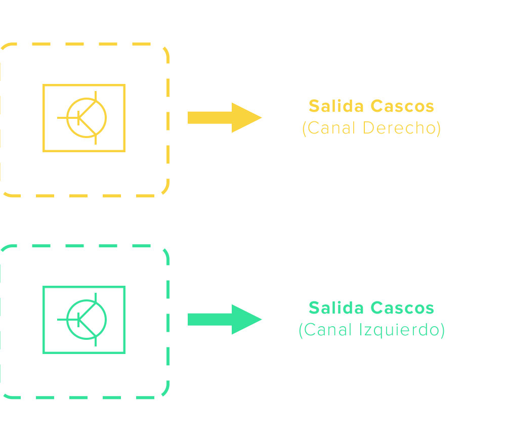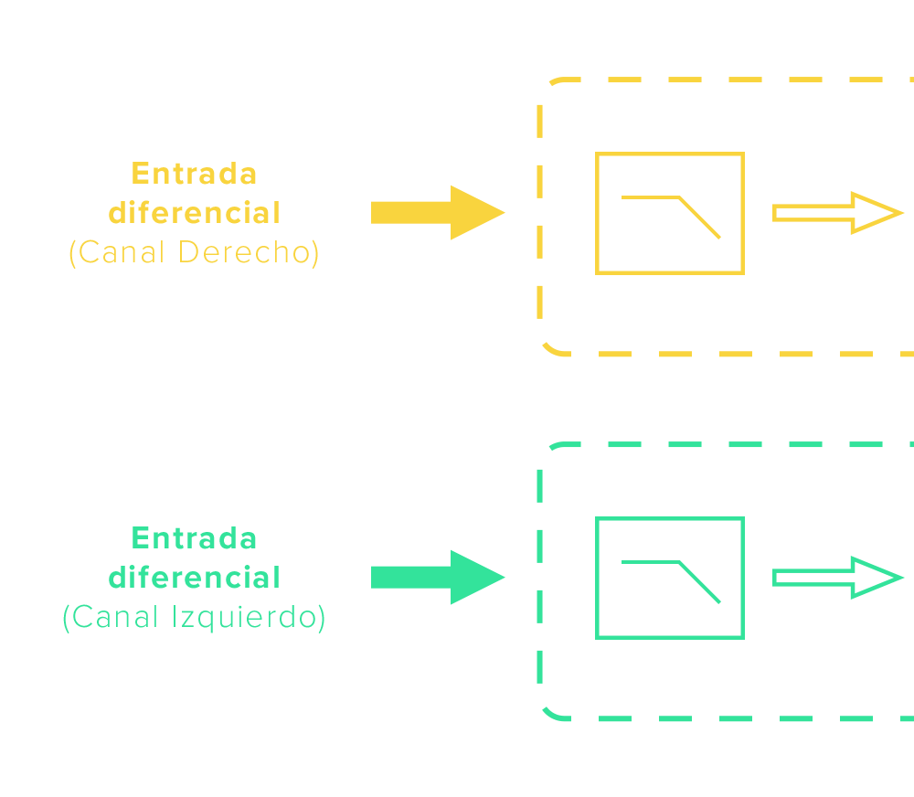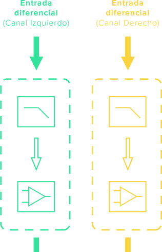 Cada canal de audio (Izquierdo y Derecho) pasa por 3 etapas de circuitos de amplificación individuales: