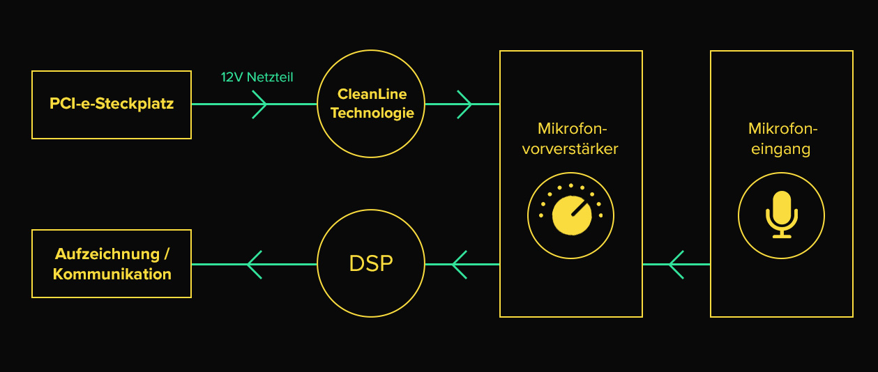 La tecnología CleanLine de AE-9 presenta un circuito especiamente diseñado y componentes que eliminan el problema de tensión en el carril y aisla el ruido en la ruta del micrófono que típicamente afecta a las tarjetas de sonido internas. Además, usamos un driver diferencial para la señal del micro para reducir el ruido de modo común que podría ser inducido por otras fuentes electrónicas.