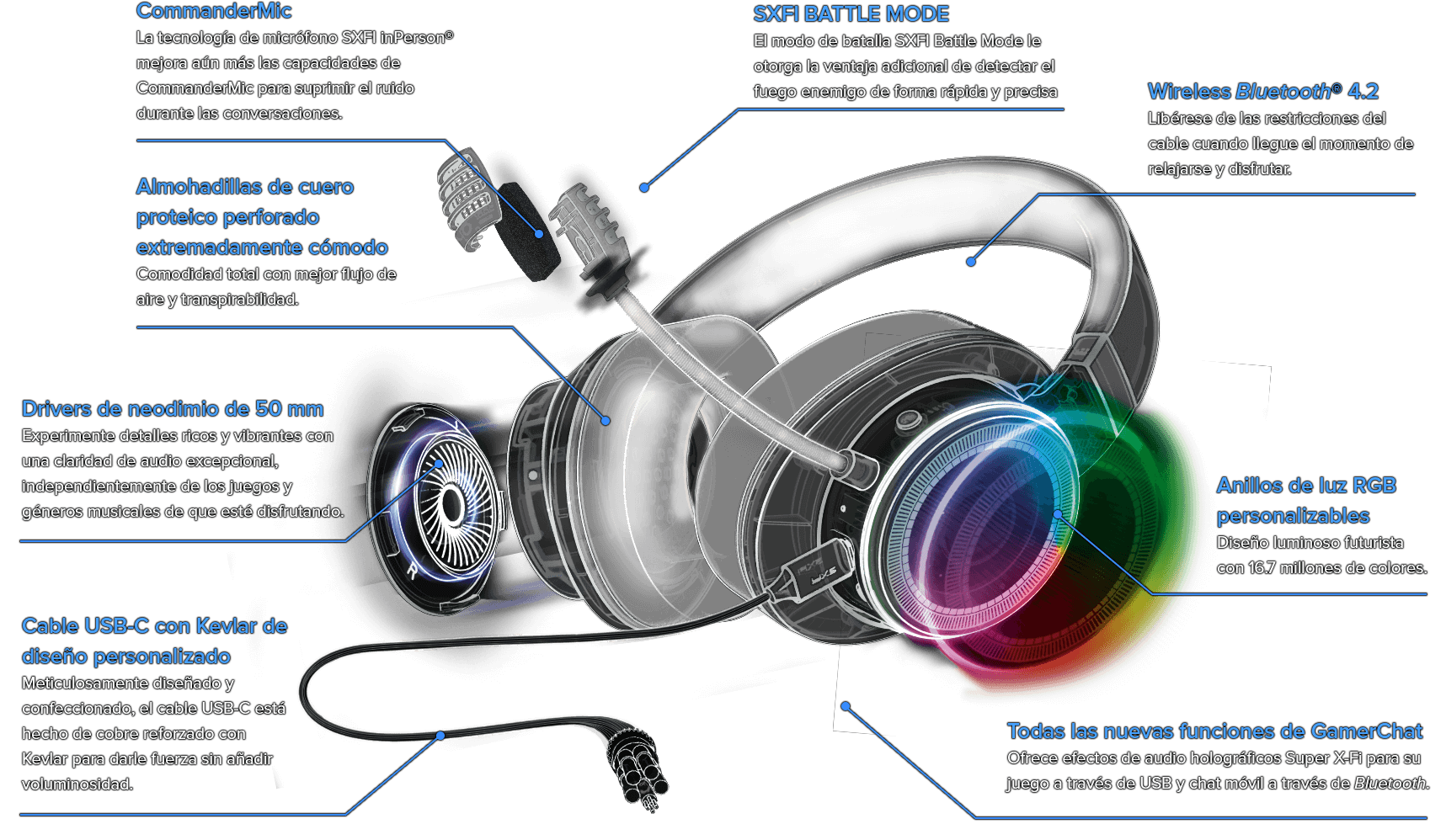 Presentamos lo último en Headphone Holography híbrida con SXFI AIR GAMER, unos versátiles cascos con micrófono para juegos con cable y Bluetooth 4.2, que le dan la libertad de conectarse a cualquier dispositivo compatible de su elección o conectarse de forma inalámbrica para disfrutar de audio personalizado de Headphone Holography Super X-Fi.
